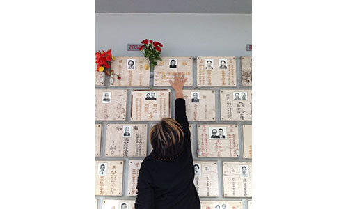 The author reaching to touch her maternal grandmother’s niche in Cape Collinson Columbarium, Hong Kong. This morning, I paid my respects to my maternal grandmother in front of the niche…