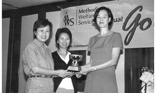 Ms Janet Lim (left) and Ms Judith Chua (centre) of the Ladies’ champion team from Paya Lebar Methodist Church receiving the Rosalyn Tay Trophy from Mrs Lucy Toh. — MWS…